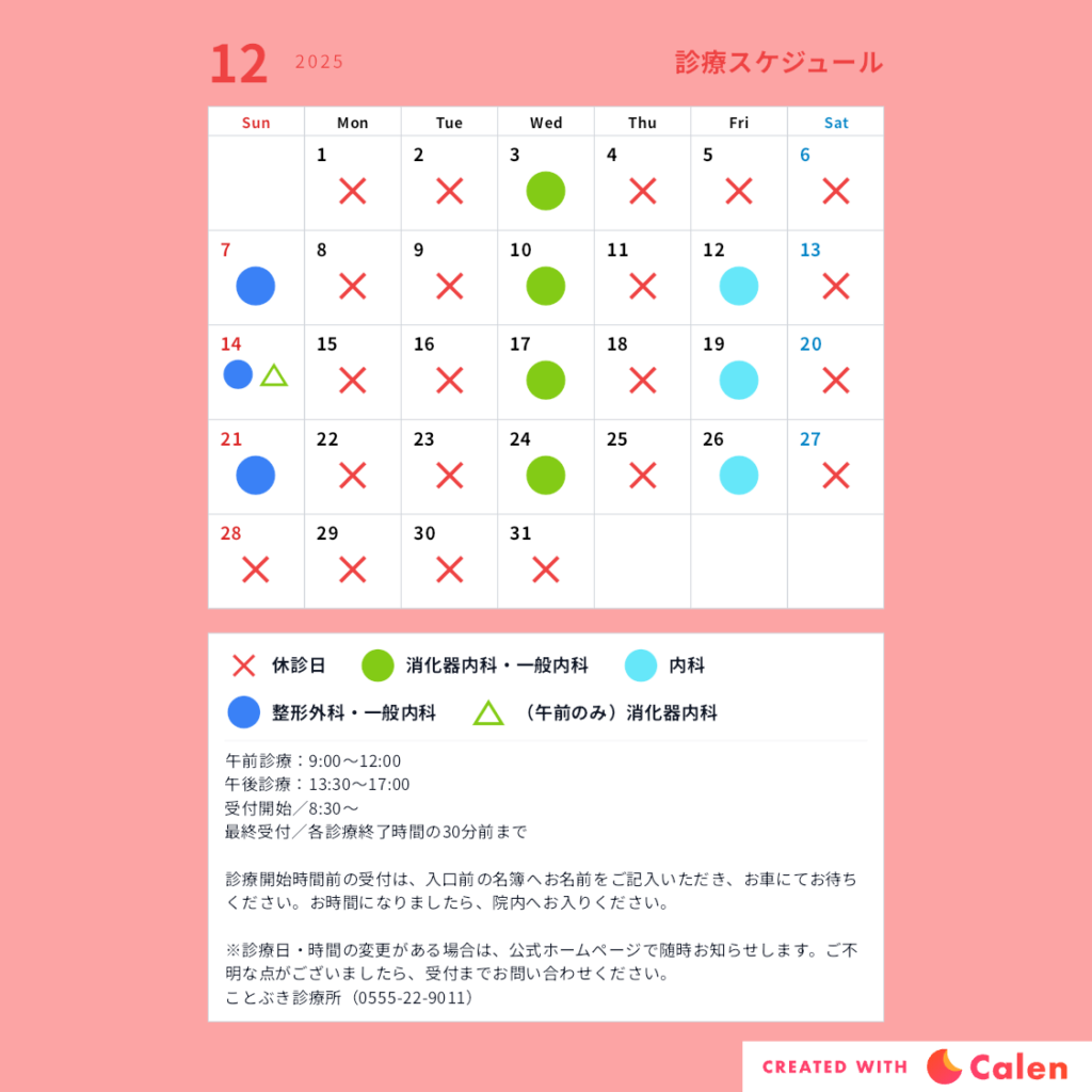 (12/12更新:金曜・高野医師の診療スケジュールを追加しました)